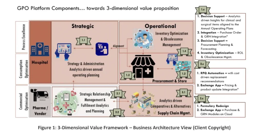 The Referenced Client envisioned as platform (or multisided market) business model that creates value by facilitating exchanges between manufacturers / distributors and hospitals / healthcare providers. The underlying vision of the client was to deliver optimized costs and drive operational and clinical excellence for Hospitals and Healthcare Providers. While the USA healthcare sector leverages a GPO, routing over 95% of all its needs and delivers saving in the range of 10%-30%, this is a novel feature in developing markets. It is further complicated by a highly defragmented outbound supply chain, specifically for the non-clinical items and generics.The Reference Client’s strategy was to deliver impact through the 3 dimensions of,